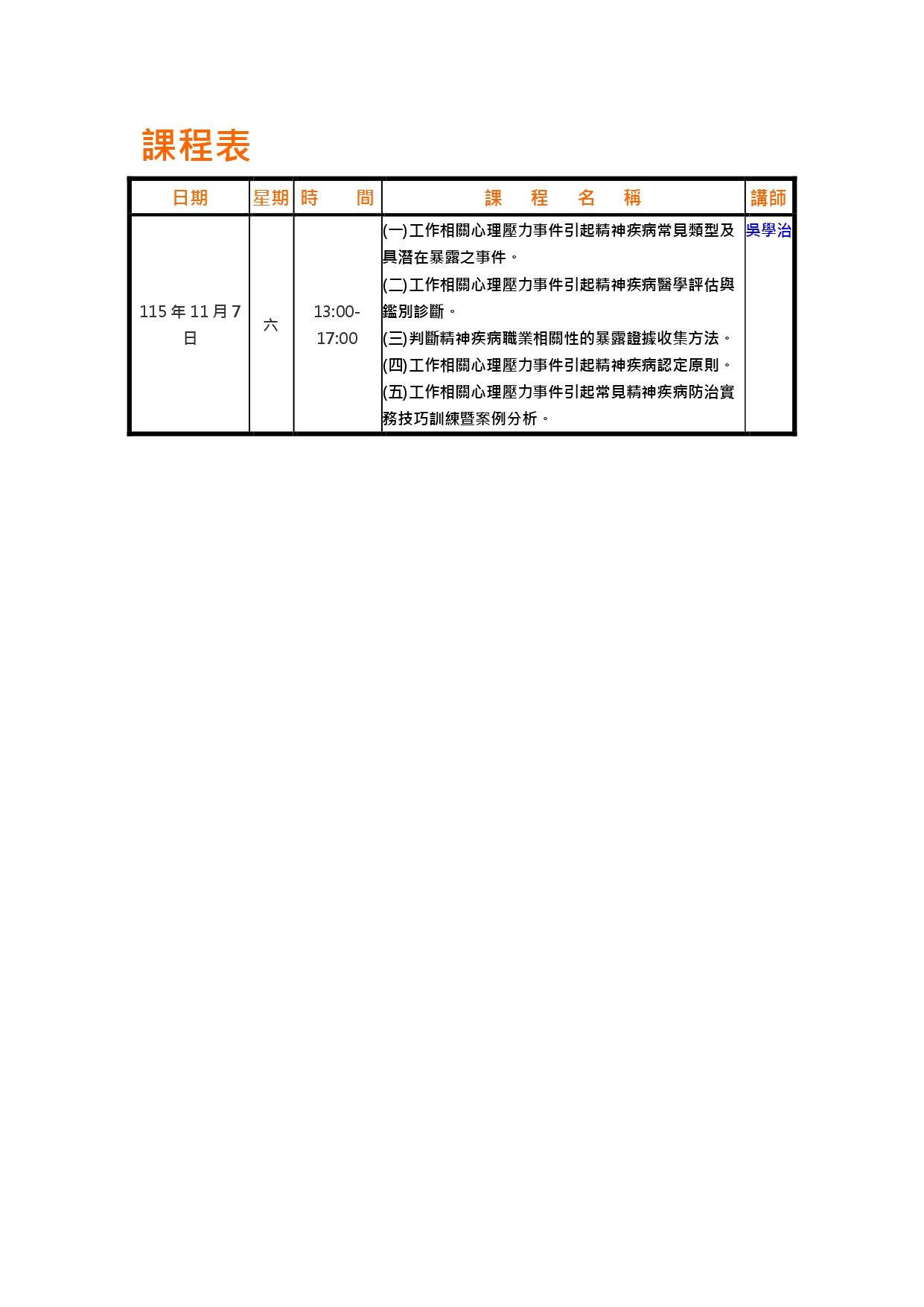 (一) 開課日期:115年11月7日(星期六)13:00~17:00。