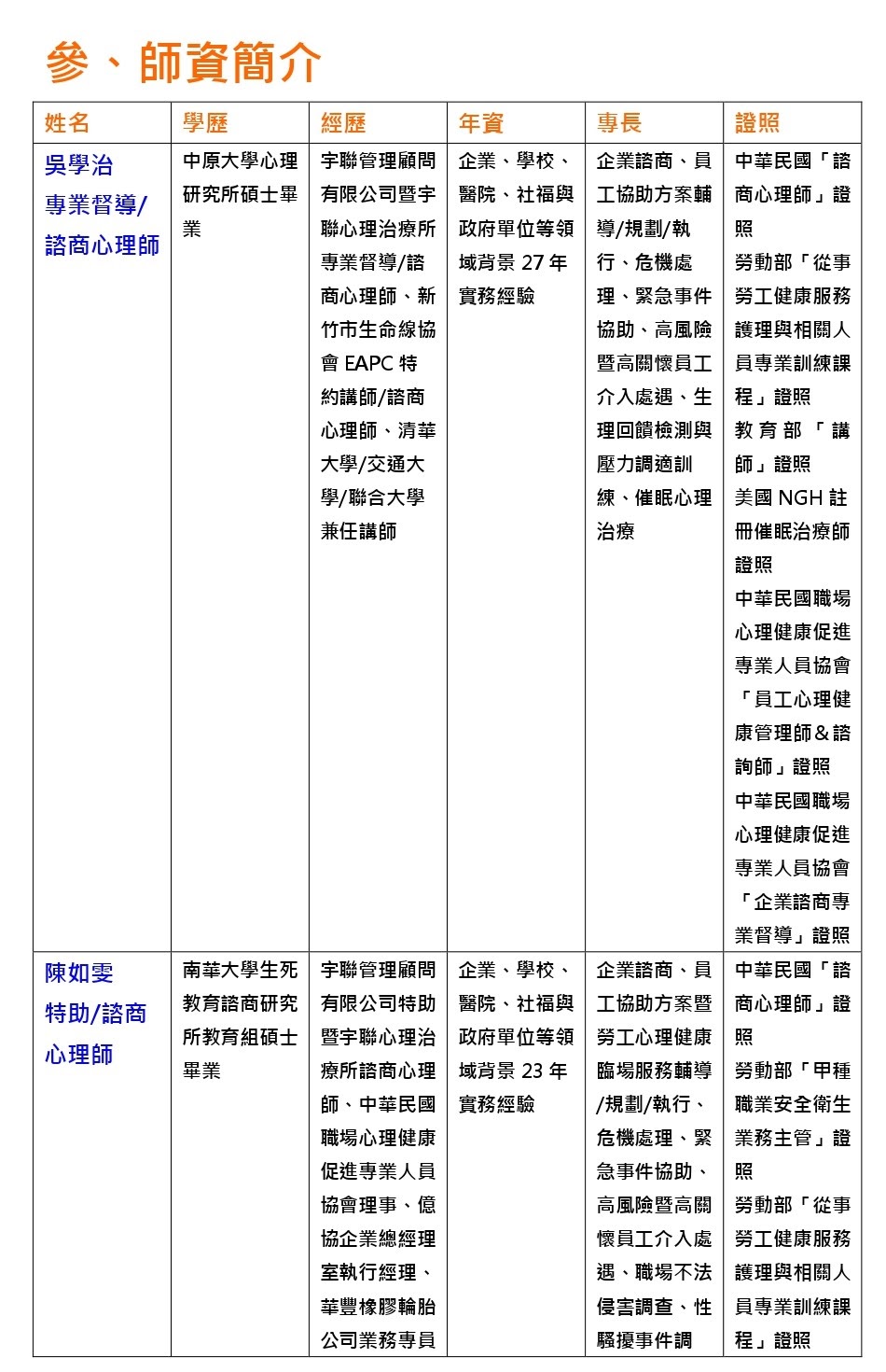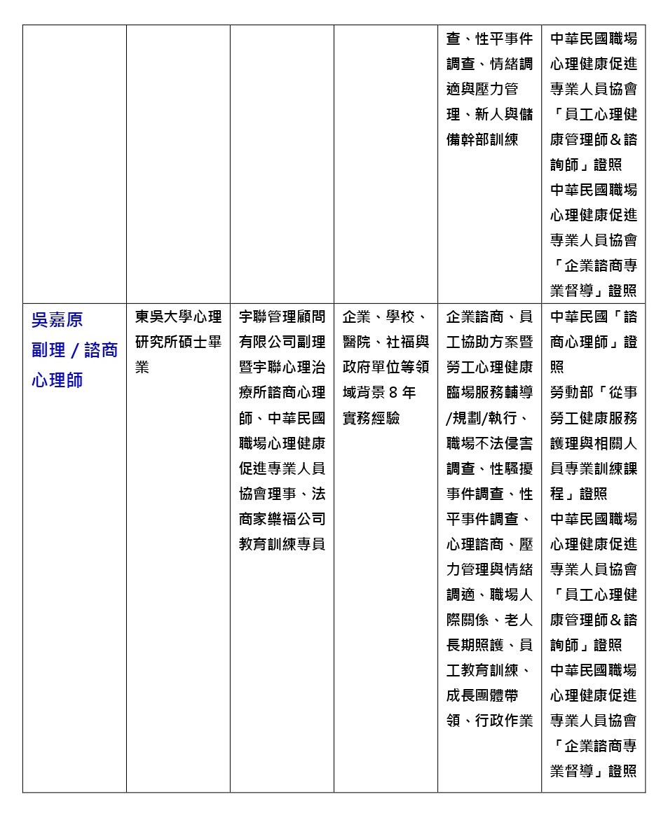 因此,宇聯管理顧問有限公司針對國內從事勞工身心健康臨場服務工作者包含HR、勞安、職安、環安、公衛、醫管、管理、醫師、護理師、臨床心理師、諮商心理師、職能治療師、物理治療師、社會工作師等所需之心理職業病或職業災害預防安全衛生措施專業職能訓練,特地'..請國內具10~25年寶貴企業諮商、EAP與勞工心理健康臨場服務經驗之心理師群專業團隊,針對國內事業單位近年來高度關注的職場暴力、職場人際衝突、異常工作負荷過勞、心理職業病防治以及高風險暨高關懷員工處遇等心理職業災害議題,融合各產業數十年的企業諮商、EAP與勞工心理健康臨場服務經驗設計出確實符合台灣地區事業單位員工心理健康促進需求的員工心理健康管理師與員工心理健康諮詢師兩項專業訓練認定課程。學員在經過為期24小時的密集專業訓練,將能具備在不同產業或組織型態推行各種企業諮商、EAP與勞工心理健康臨場服務所需專業知識技能包括提供員工心理健康管理方案或是員工心理諮商諮詢服務,進而增強員工心理健康、優化員工心理素質、提升員工工作效率,以達到能為組織及員工帶來最大效益與福祉的雙贏目標。